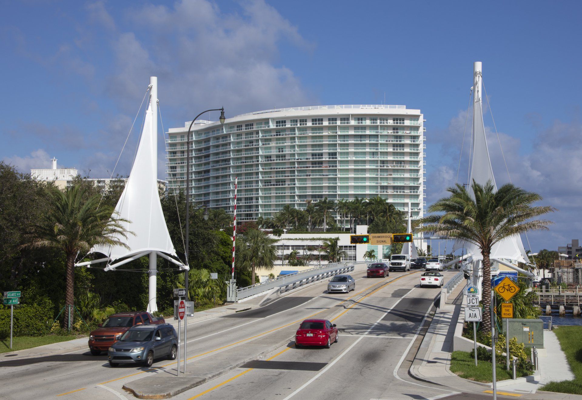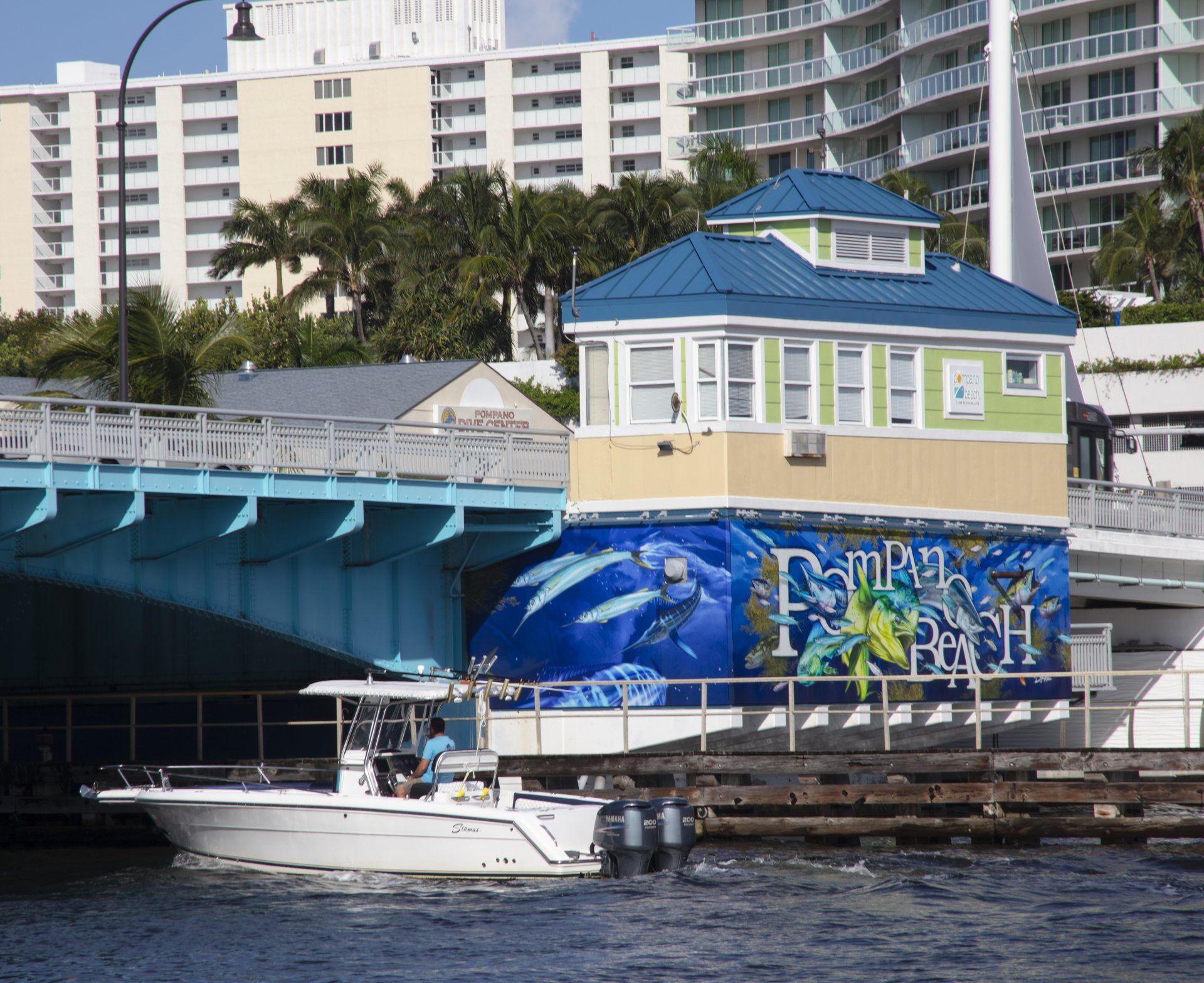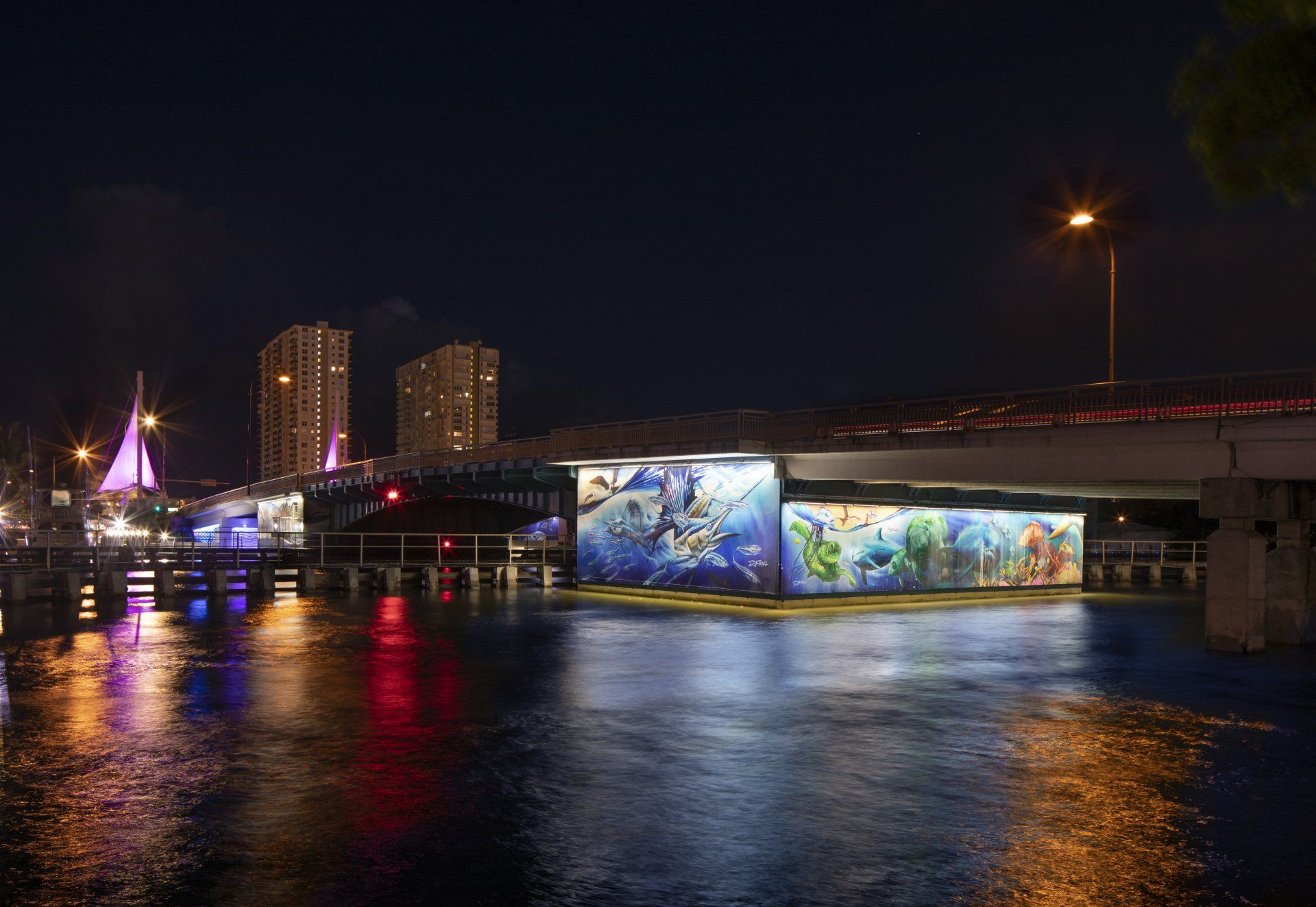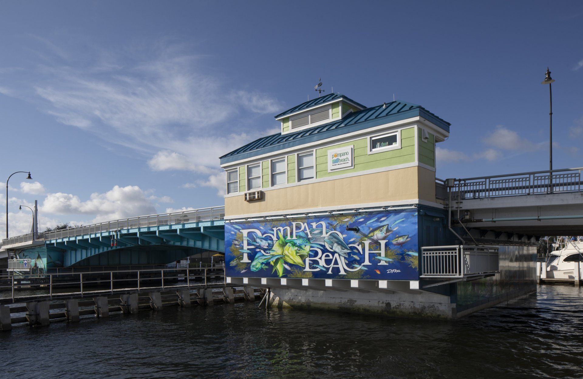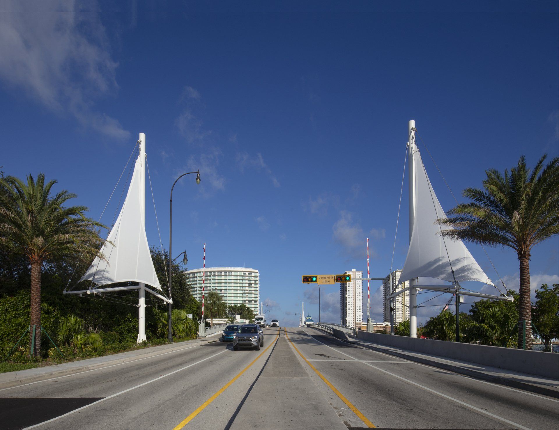 The Atlantic Boulevard Bridge Improvements included a renovation of the bridge’s north and south façades and the tender house, new sidewalks, computerized uplighting, land-based lighting, large decorative sails on the four corners of the bridge and marine-inspired murals by local artist Dennis Friel. The bridge’s concrete side barriers were replaced with open metal railings to offer pedestrians and vehicles better views of the Intracoastal, as well as to prevent rain buildup along the roadways. A pedestrian waterfront promenade was constructed under the east side of the bridge for better connectivity.